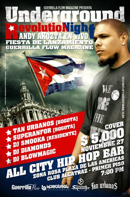 Gran Lanzamiento del Magazine Guerrilla Flowcontaremos con la presencia de Randy Akozta desde Cuba, asi como Tan Urbanos y Superanfor de Bogotá junto a Dj Smooka [Residente], Dj BlowMagic y Dj Diamonds.